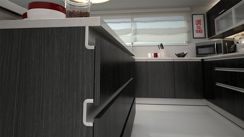 Sistema de perfiles en aluminio que permiten simplificar los frentes de los módulos, para evitar colocar tiradores en tus cocinas.
